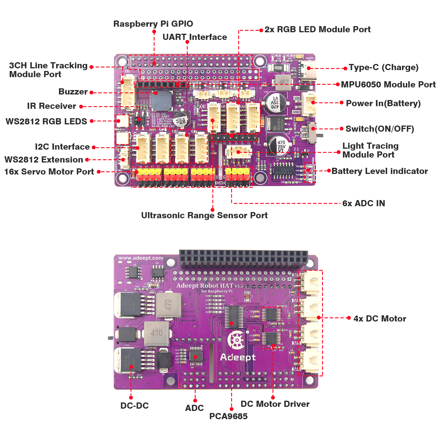 Adeept Robot HAT is a robot driver board and must be used in conjunction with a Raspberry Pi. Compatible with Raspberry Pi 5/4B/3B/3B+. With it, you can easily DIY your Raspberry Pi robot and smart car, etc.