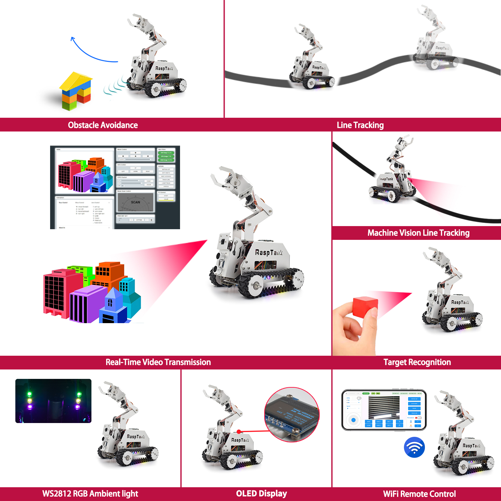 • [Multiple Functions] Obstacle avoidance, Line tracking, OLED Display, Computer vision line tracking, Wi-Fi remote control, Target recognition, Real-time video transmission, RGB light.