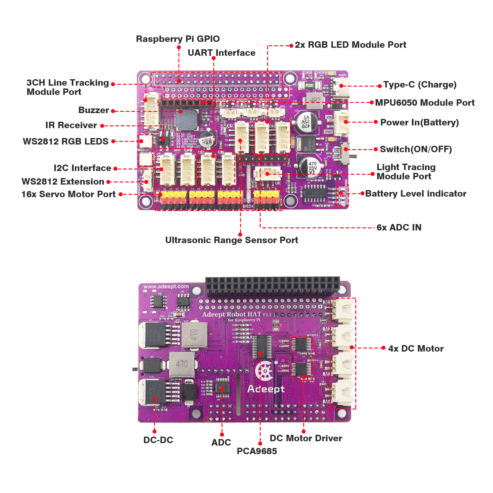 • Adeept Robot HAT V3.3(Motor driver board & Servo controller);